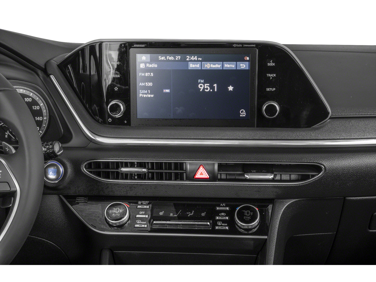 - Radio: AM/FM/SiriusXM/MP3 Display Audio -inc: 8" color touchscreen, HD Radio, Blue Link, smartphone integration w/Apple CarPlay and Android Auto, Bluetooth® hands-free phone steering audio controls and Bose premium audio w/12 speakers (1 center channel, 2 dash, 2 front tweeter, 4 door mounted, 2 rear mounted speakers + 1 rear mounted subwoofer)