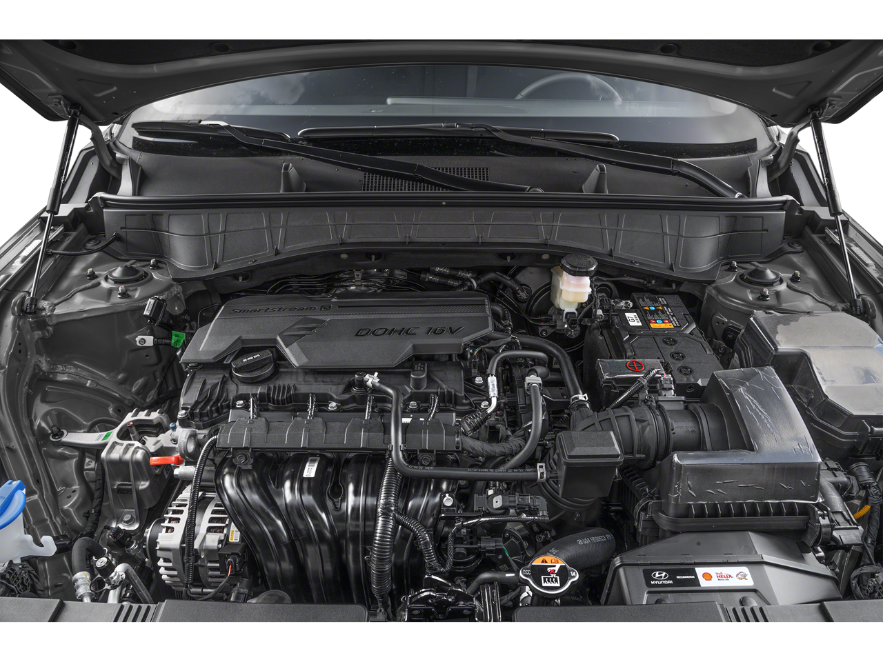 This vehicle comes equipped with : Option Group 01, 4-Wheel Disc Brakes, 6 Speakers, 6.052 Axle Ratio, ABS brakes, Air Conditioning, Alloy wheels, AM/FM radio: SiriusXM, Apple CarPlay & Android Auto, Auto High-beam Headlights, Automatic temperature control, Brake assist, Bumpers: body-color, Cloth Seat Trim, Delay-off headlights, Driver door bin, Driver vanity mirror, Dual front impact airbags, Dual front side impact airbags, Electronic Stability Control, Emergency communication system: Bluelink+, Exterior Parking Camera Rear, Four wheel independent suspension, Front anti-roll bar, Front Bucket Seats, Front Center Armrest, Front dual zone A/C, Front reading lights, Fully automatic headlights, Heated door mirrors, Illuminated entry, Leather Shift Knob, Leather steering wheel, Low tire pressure warning, Occupant sensing airbag, Outside temperature display, Overhead airbag, Panic alarm, Passenger door bin, Passenger vanity mirror, Power door mirrors, Power driver seat, Power steering, Power windows, Radio: AM/FM/HD Radio/SiriusXM Audio System, Rear anti-roll bar, Rear seat center armrest, Rear window defroster, Rear window wiper, Remote keyless entry, Security system, Speed control, Speed-sensing steering, Split folding rear seat, Spoiler, Steering wheel mounted audio controls, Tachometer, Telescoping steering wheel, Tilt steering wheel, Traction control, Trip computer, Turn signal indicator mirrors, Variably intermittent wipers, and Wheels: 18" x 7.0J Glossy Black Alloy.