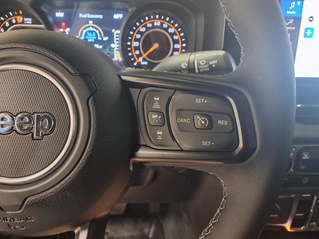 This vehicle comes equipped with: Convenience Group (Corning Gorilla Glass, Daytime Running Lamp System, Emergency/Assistance Call, Front Door Locks 2-Door Passive Entry, Heated Front Seats, Heated Steering Wheel, Remote Start System, and Universal Garage Door Opener), Quick Order Package 24J Texas Trail (97 MPH Vehicle Max Speed Calibration, Advanced Brake Assist, Automatic Headlamps, Body Color 3-Piece Hard Top, Body Color Fender Flares (2-Piece), Deep Tint Sunscreen Windows, Freedom Panel Storage Bag, Full Length Floor Console Premium Armrest, Full Speed Forward Collision Warning Plus, Hard Seat Back, Integrated Radar Camera Module (IRCM), Leather Wrapped Park Brake Handle, Leather Wrapped Shift Knob, Power 4-Way Driver Lumbar Adjust, Power 4-Way Passenger Lumbar Adjust, Power Adjust 8-Way Driver Seat, Power Adjust 8-Way Front Passenger Seat, Power Heated Mirrors, Premium Door Trim Panel, Premium McKinley Trimmed Seats, Premium Wrapped Steering Wheel, Rear Armrest w/Cupholder Seat, Rear Sliding Window, Rear Window Defroster, Security Alarm, Sun Visors w/Illuminated Vanity Mirrors, Texas Trail, Texas Trail Tailgate & Hood Decals, Wheels: 17 x 7.5 Painted Black, and Willys Suspension), 110 MPH Vehicle Max Speed Calibration, 12.3 Touchscreen Display, 3.73 Rear Axle Ratio, 4-Wheel Disc Brakes, 4G LTE Wi-Fi Hot Spot, 8 Speakers, ABS brakes, Air Conditioning, Alexa Built-In, AM/FM radio: SiriusXM, Apple CarPlay, Apple CarPlay/Android Auto, Brake assist, Cloth Low-Back Bucket Seats, Compass, Connectivity - US/Canada, Delay-off headlights, Driver door bin, Driver vanity mirror, Dual front impact airbags, Dual front side impact airbags, Electronic Stability Control, Front anti-roll bar, Front Bucket Seats, Front Center Armrest w/Storage, Front fog lights, Front License Plate Bracket, Front reading lights, Google Android Auto, Illuminated entry, Integrated roll-over protection, Low tire pressure warning, MOPAR All-Weather Slush Mats, MOPAR Spray In Bedliner, Normal Duty Suspension, Occupant sensing airbag, Outside temperature display, Overhead airbag, Panic alarm, ParkView Rear Back-Up Camera, Passenger door bin, Passenger vanity mirror, Power steering, Power windows, Radio data system, Radio: Uconnect 5 w/12.3 Display, Rear anti-roll bar, Rear reading lights, Remote keyless entry, Side Steps, Speed control, Split folding rear seat, Steering wheel mounted audio controls, Tachometer, Telescoping steering wheel, Tilt steering wheel, Traction control, Trip computer, USB Host Flip, Variably intermittent wipers, Voltmeter, and Wheels: 17 x 7.5 Black Steel Styled.